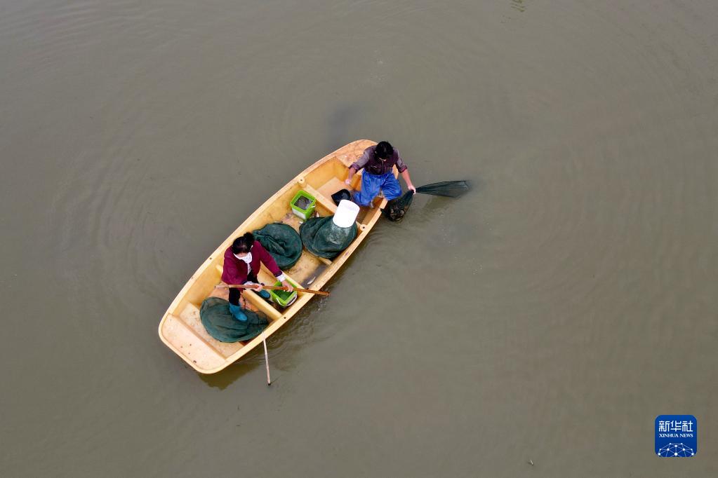 9月8日,在五河縣沱湖鄉大崗村大閘蟹養殖基地,當地農戶(hù)在捕撈大閘蟹(無(wú)人機照片)。