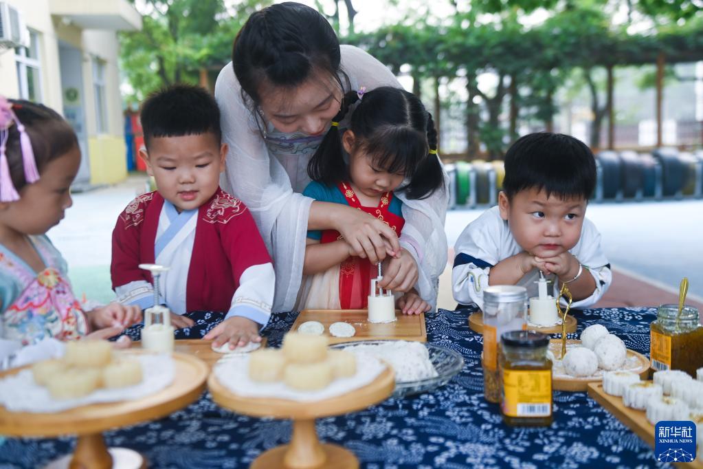 9月8日,長(cháng)橋中心幼兒園的孩子們在老師的帶領(lǐng)下自制桂花月餅。