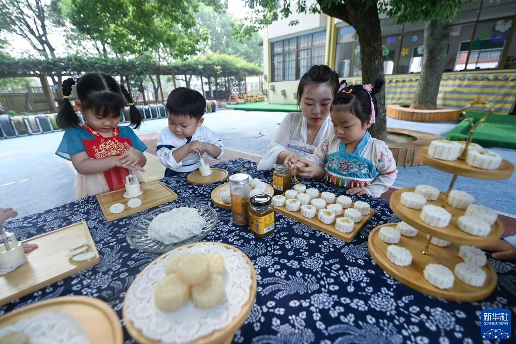 9月8日,長(cháng)橋中心幼兒園的孩子們在老師的帶領(lǐng)下自制桂花月餅。