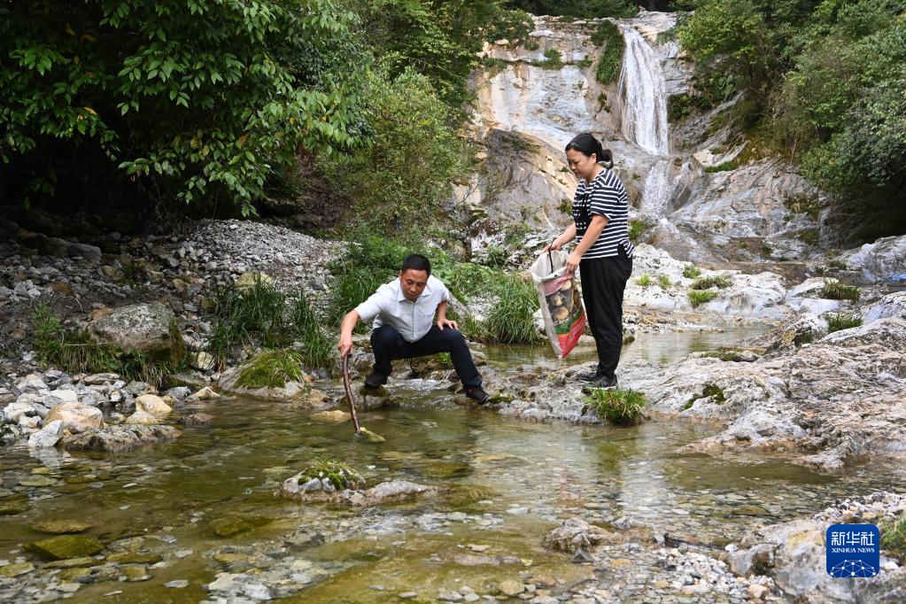 張邦貴的孫女張小翠和丈夫龍明春在漢江源頭撿拾垃圾(9月6日攝)。十幾年前,漢水源村的張邦貴每天拿著(zhù)火鉗和垃圾袋,在河道旁、山路上往返數公里撿拾垃圾。如今,老人雖已逝去,張邦貴的后代和越來(lái)越多的村民、志愿者義務(wù)撿拾垃圾,維護漢江源頭的河道清潔。