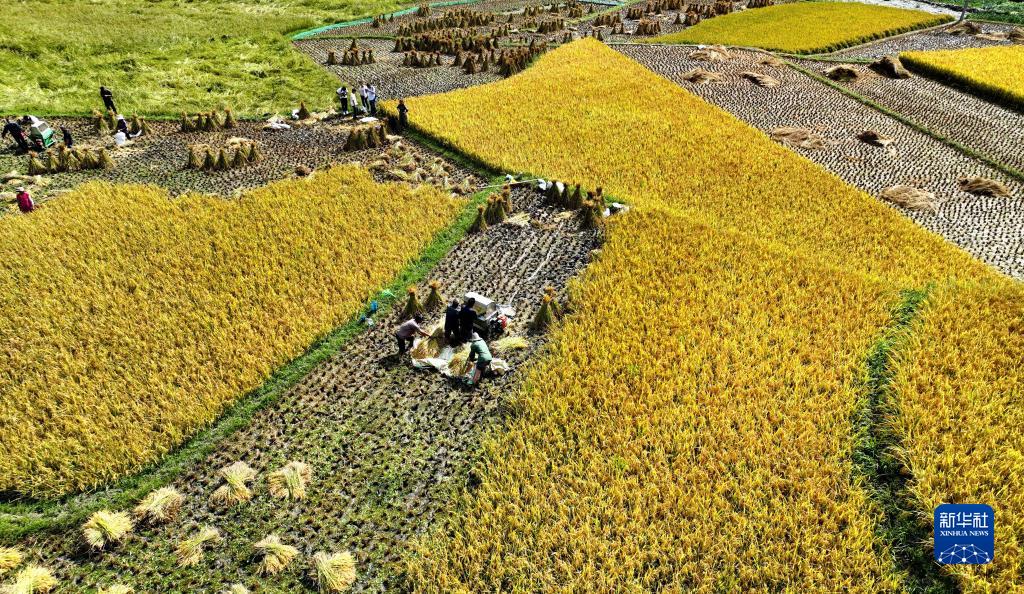 寧強縣漢源街道西溝村群眾在收獲香谷水稻(9月6日攝,無(wú)人機照片)。