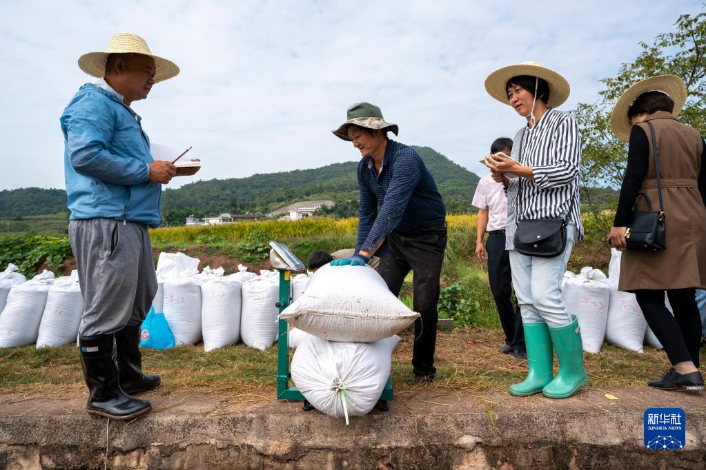 9月8日,工作人員在測產(chǎn)現場(chǎng)對“楚粳54號”稻谷稱(chēng)重并記錄。