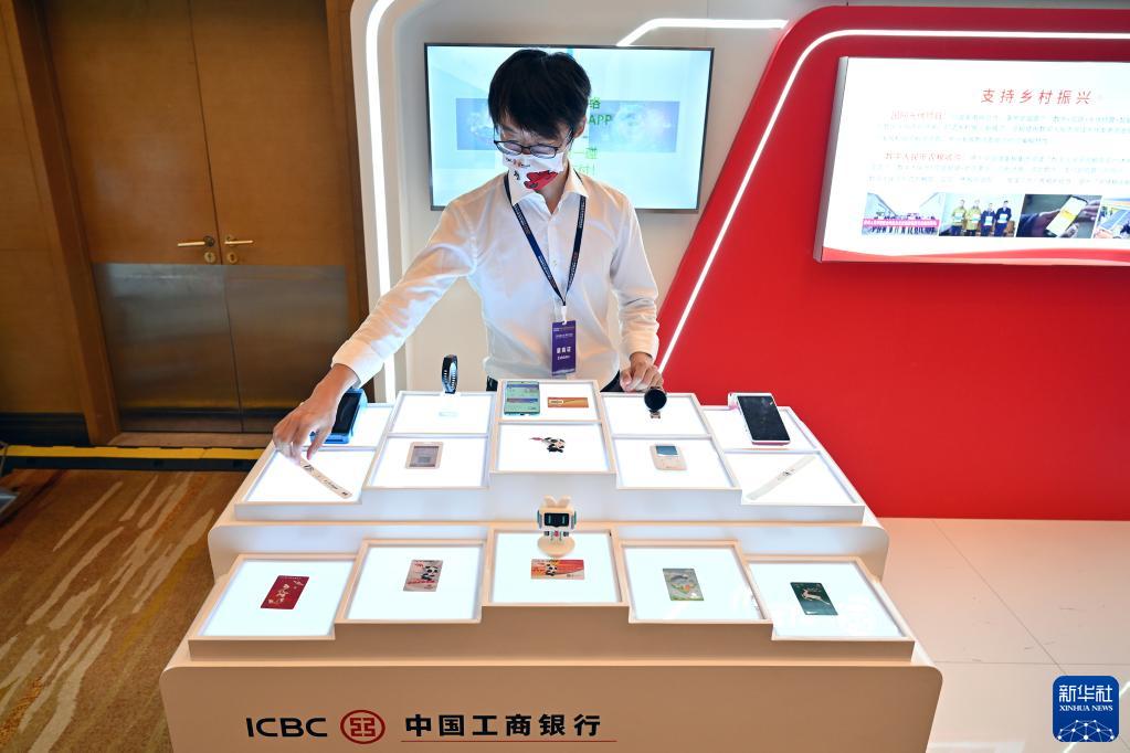 9月8日,在論壇設置的數字人民幣體驗區,工商銀行展臺的工作人員擺放數字人民幣硬錢(qián)包產(chǎn)品。