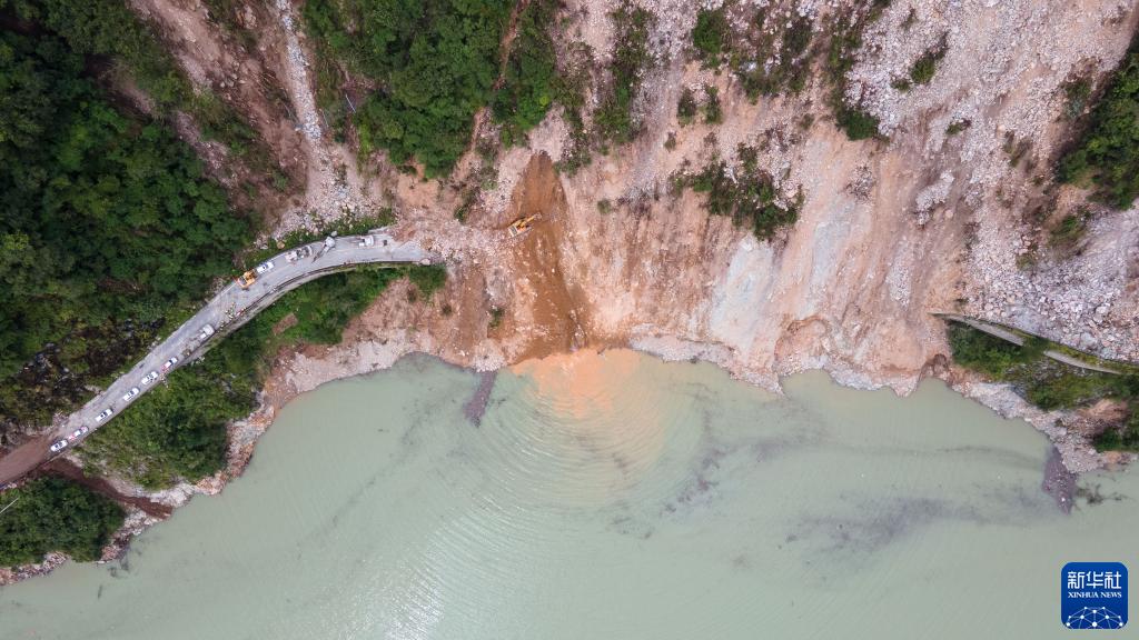 9月8日,四川路橋的工作人員搶修石棉縣與瀘定縣得妥鎮之間的道路(無(wú)人機照片)。