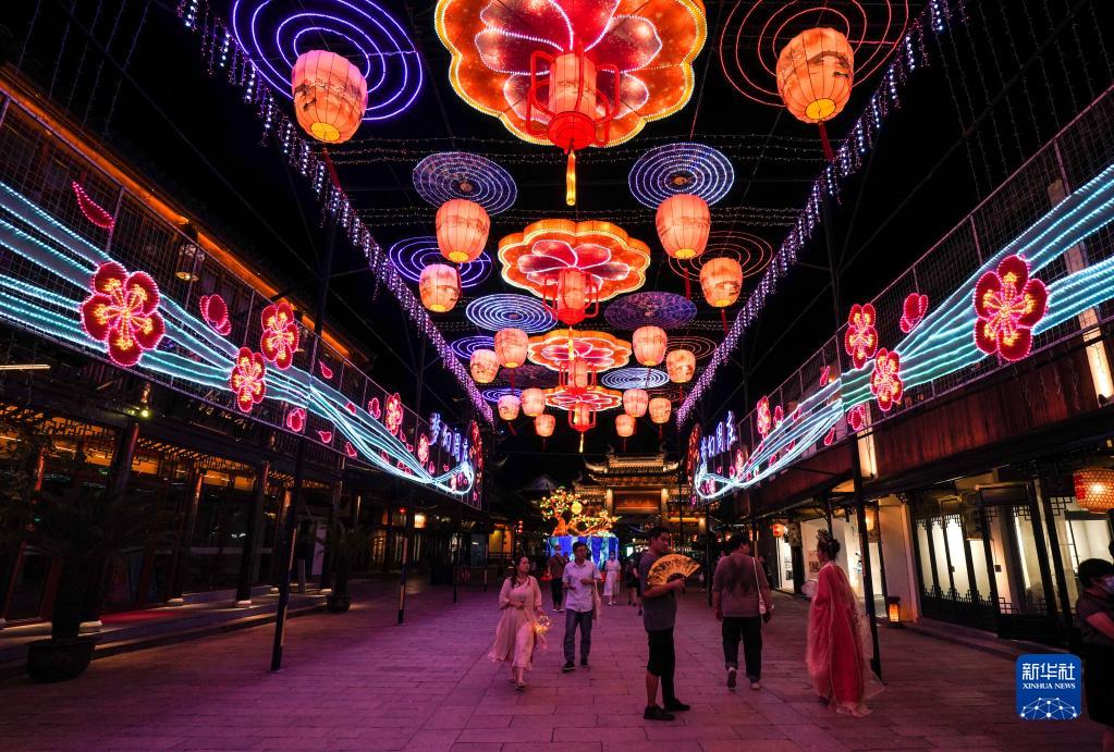 9月7日,游客在周莊觀(guān)賞正在調試中的燈彩。
