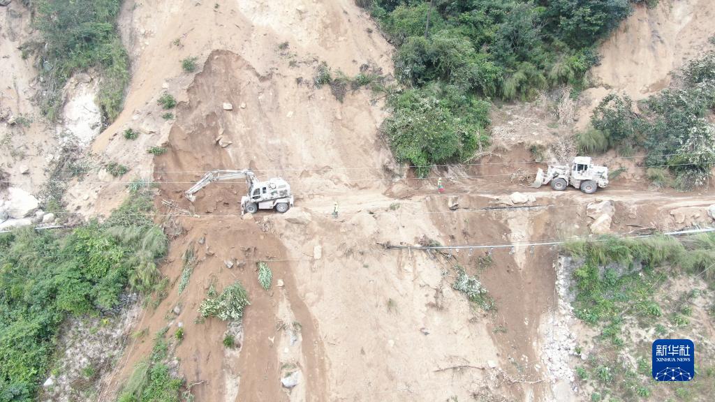 9月8日,西部戰區陸軍第77集團軍某工兵旅官兵在雅安市石棉縣進(jìn)行道路搶通作業(yè)。(無(wú)人機照片)。新華社發(fā)(李雪嬌 攝)