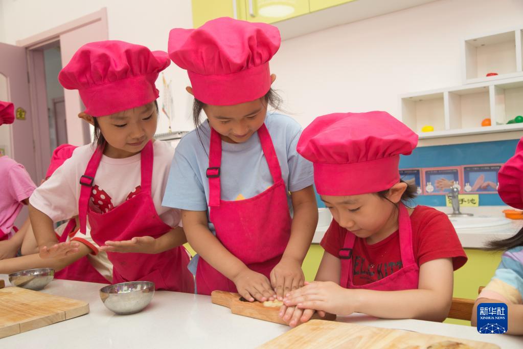 9月8日,北京門(mén)頭溝妙峰山民族學(xué)校附屬幼兒園的孩子們在制作月餅。