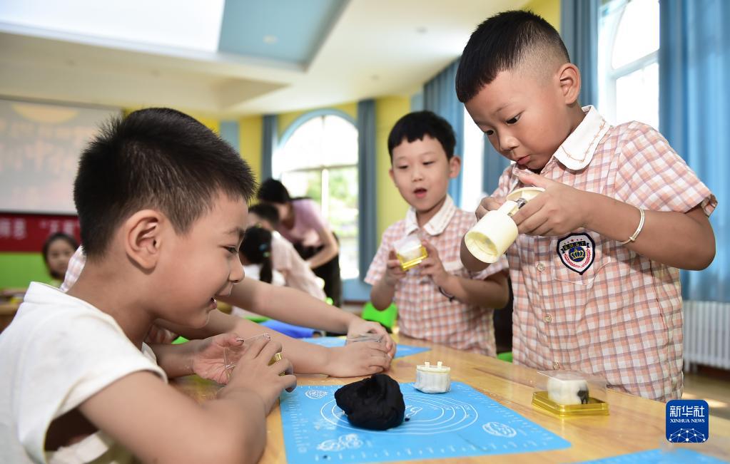 9月8日,河南省洛陽(yáng)市河柴幼兒園的小朋友在體驗制作手工月餅。