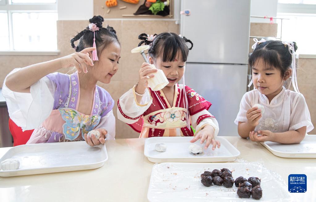 9月8日,浙江省慈溪市陽(yáng)光幼兒園(北園)的孩子們在制作冰皮月餅。