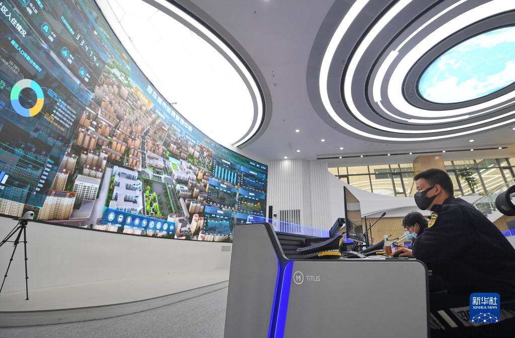 工作人員在雄安新區容東城市運營(yíng)管理中心監管平臺工作(2022年3月29日攝)。