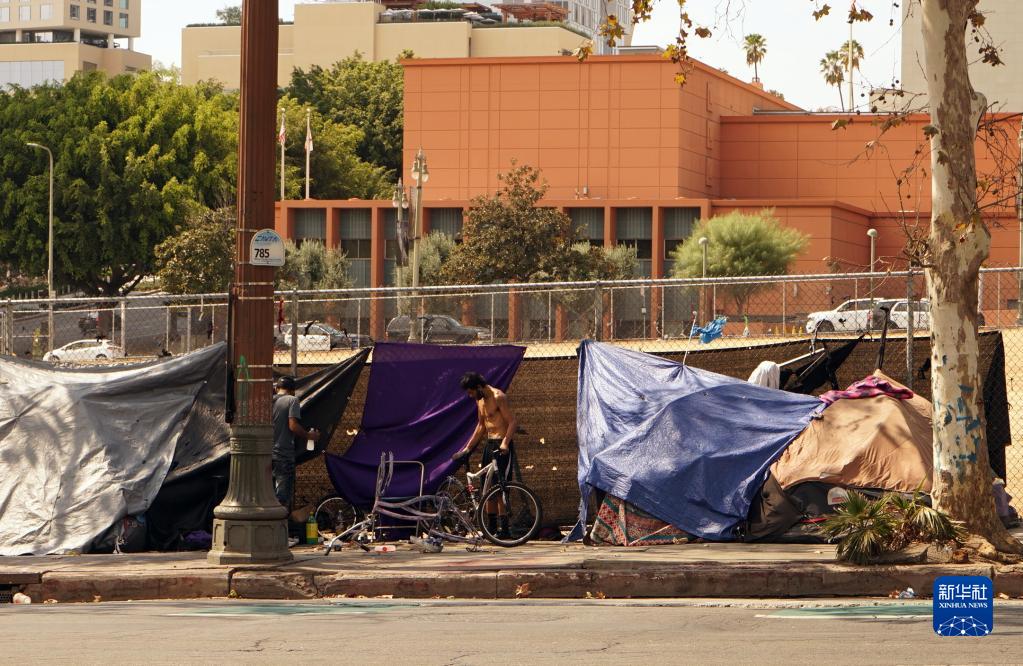 9月8日,在美國加利福尼亞州洛杉磯市區,街頭可見(jiàn)多個(gè)無(wú)家可歸者的帳篷。