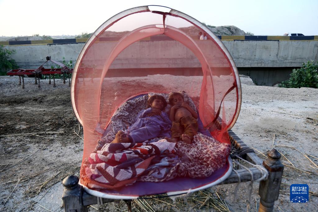 9月8日,在巴基斯坦信德省,受洪災影響的孩子們在蚊帳中休息。