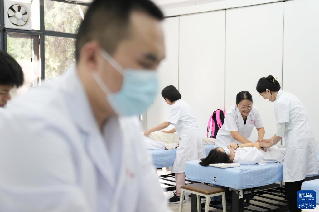 推拿按摩課程實(shí)踐性強,尤其對視障學(xué)生來(lái)說(shuō),“眼睛看不到,需要我們手把手一個(gè)個(gè)教”。每次上課張琳都要握著(zhù)學(xué)生的手,一遍遍帶他們感受手法形態(tài)、力度,觸摸骨骼、肌肉。