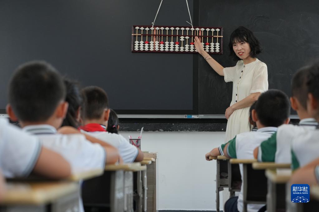 9月6日,在安徽省黃山市屯溪大位小學(xué),汪素秋在課堂上講解珠算知識。