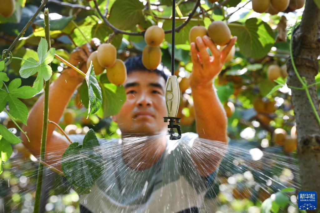 9月9日,陜西齊峰果業(yè)城固基地技術(shù)員在優(yōu)質(zhì)獼猴桃基地檢查水肥一體化施肥效果。