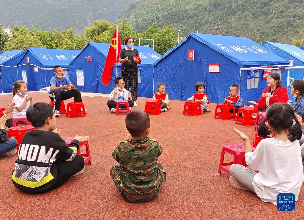 9月8日,在四川省石棉縣新民鄉海耳村臨時(shí)安置點(diǎn),老師帶領(lǐng)孩子們做游戲。