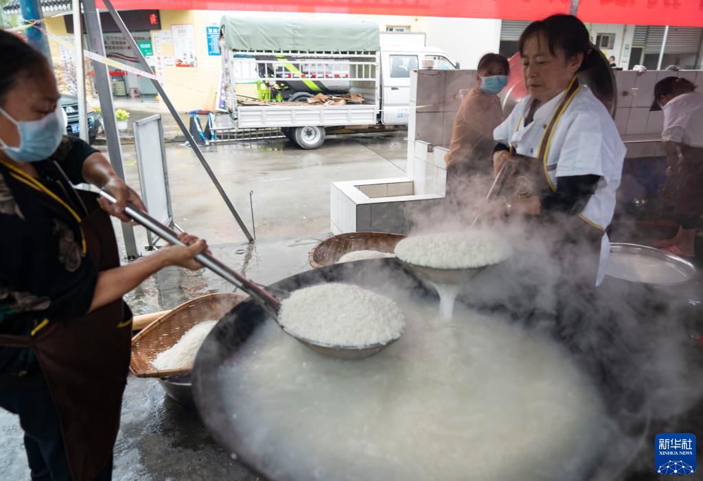 9月9日,在石棉縣新民鄉海耳村臨時(shí)安置點(diǎn),村民志愿者在做飯。