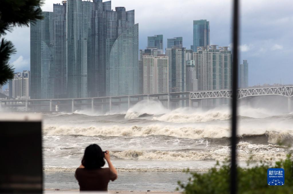 9月6日,市民在韓國釜山一海水浴場(chǎng)拍攝海浪。