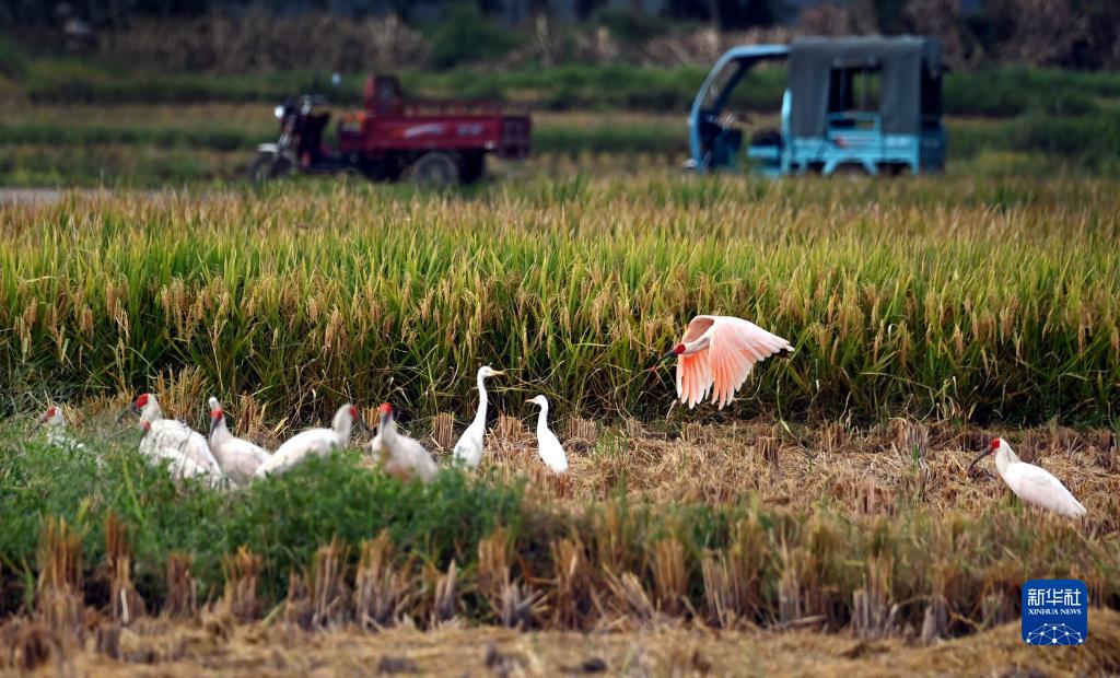 9月10日,朱鹮和白鷺在洋縣紙坊街道周家坎村稻田里停歇。