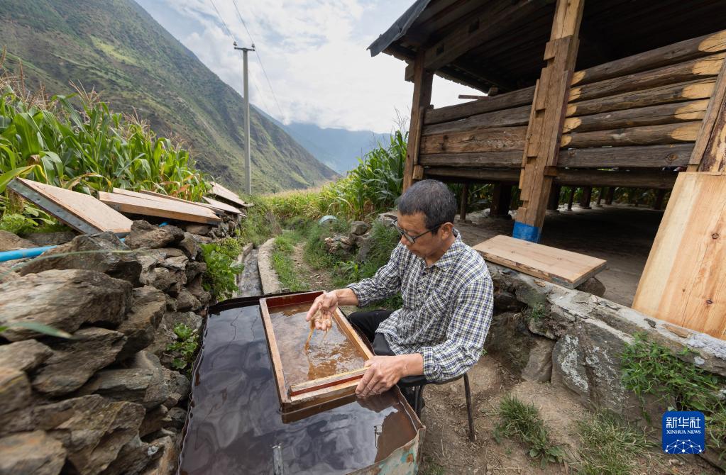 生活在四川省木里藏族自治縣納西族古村寨俄亞大村的英扎次里,是東巴文化省級非遺傳承人。通過(guò)不斷研究摸索,他逐漸掌握納西東巴古法造紙技藝。