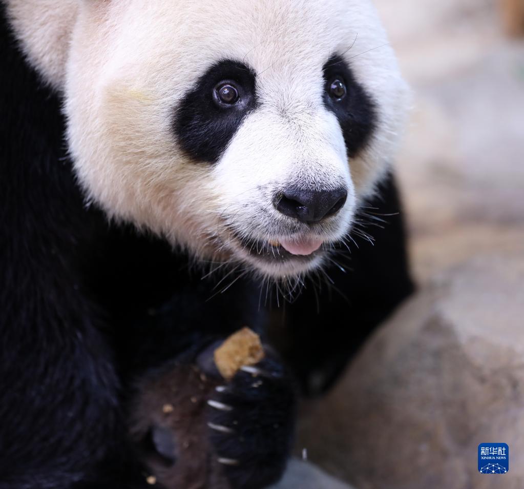 9月9日,在廣州長(cháng)隆野生動(dòng)物世界,大熊貓“帥帥”品嘗特制“月餅”。