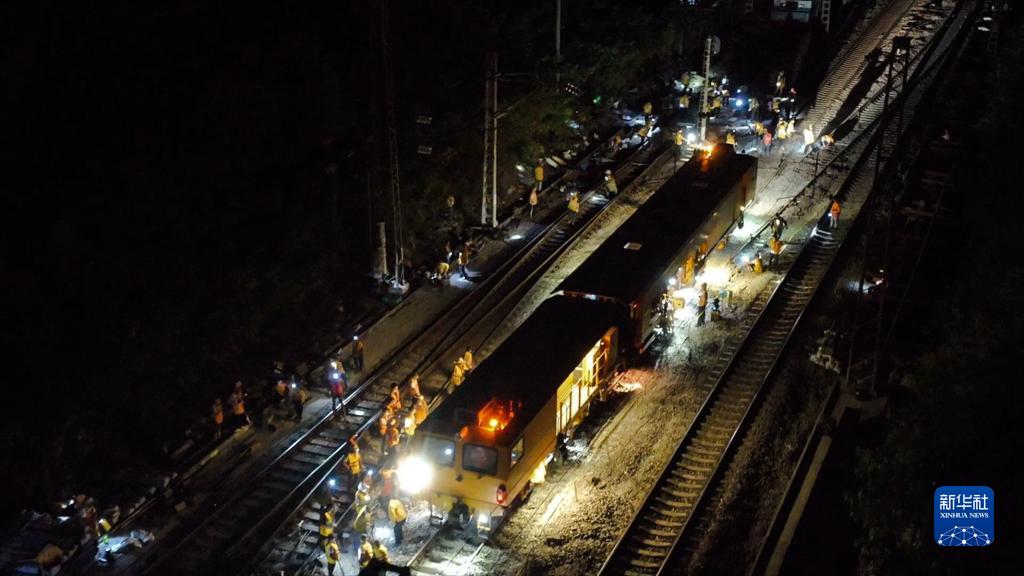 工人在柳州太陽(yáng)村站進(jìn)行夜間換岔施工(9月9日攝)。