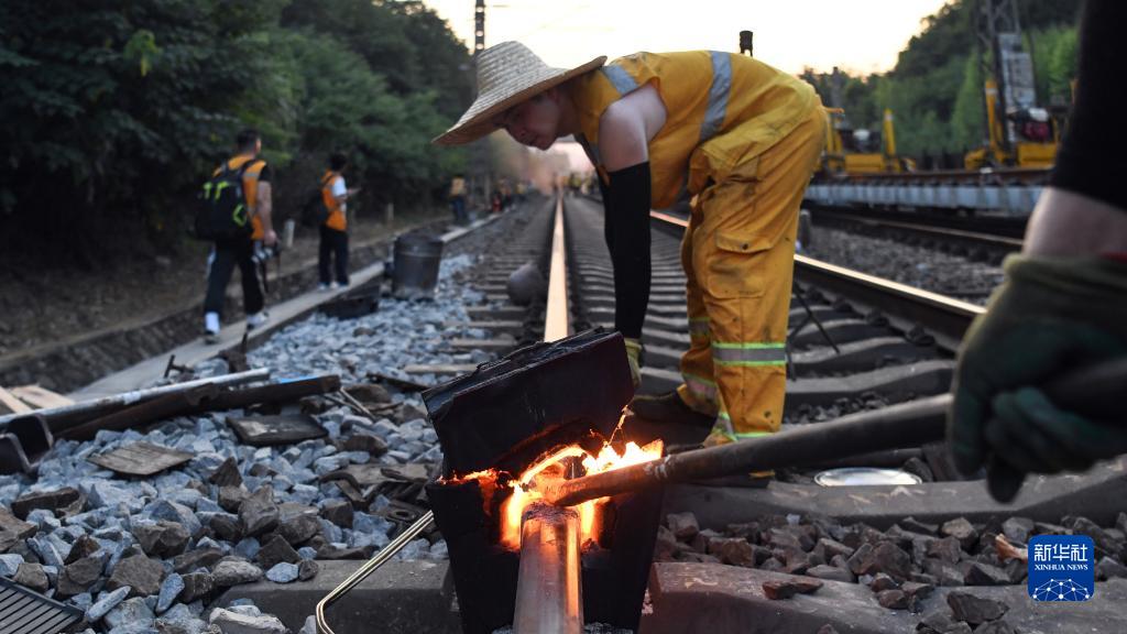 在柳州太陽(yáng)村站施工地,工人對新?lián)Q的鋼軌進(jìn)行無(wú)縫焊接(9月9日攝)。
