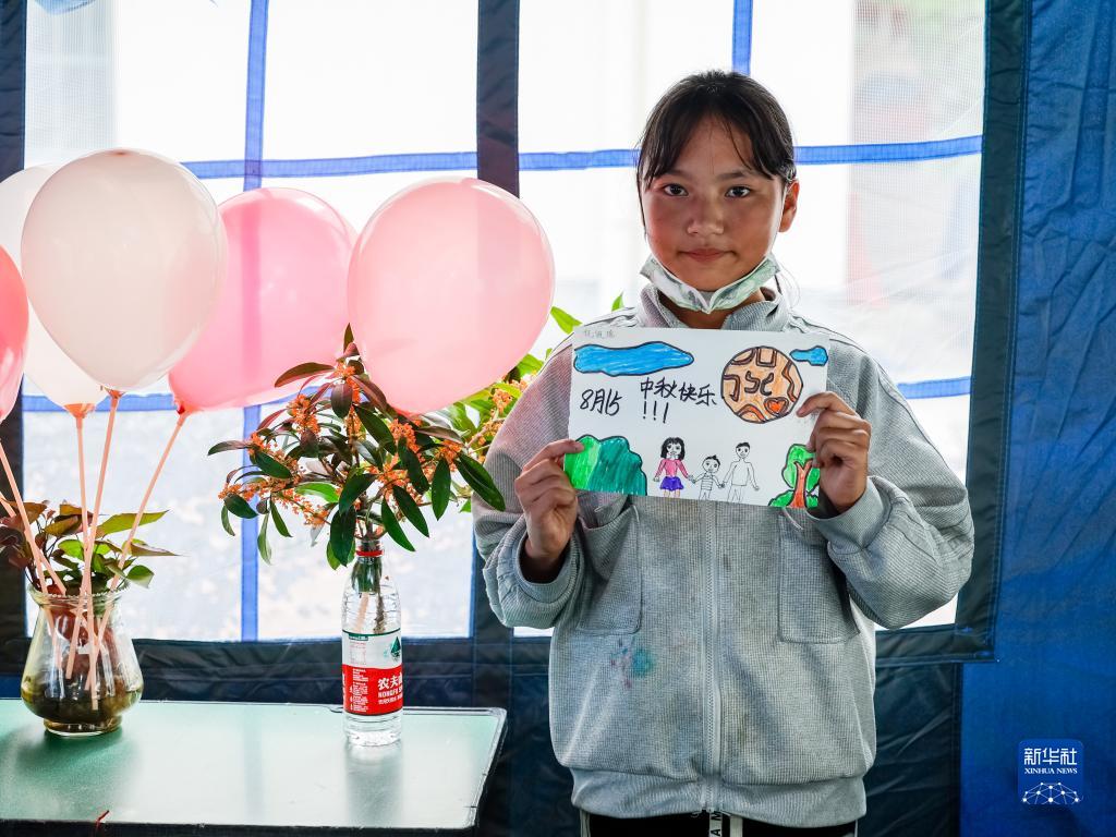 9月10日,在瀘定二中臨時(shí)安置點(diǎn)的“帳篷課堂”里,來(lái)自得妥鎮的10歲女孩倪佩瑤展示她畫(huà)的畫(huà)。地震發(fā)生后,她和其他三個(gè)兄弟姐妹由爺爺帶著(zhù)來(lái)到了這個(gè)安置點(diǎn),而爸爸媽媽則留在得妥鎮的安置點(diǎn),暫時(shí)無(wú)法團聚。她最大的心愿是早日見(jiàn)到爸爸媽媽。