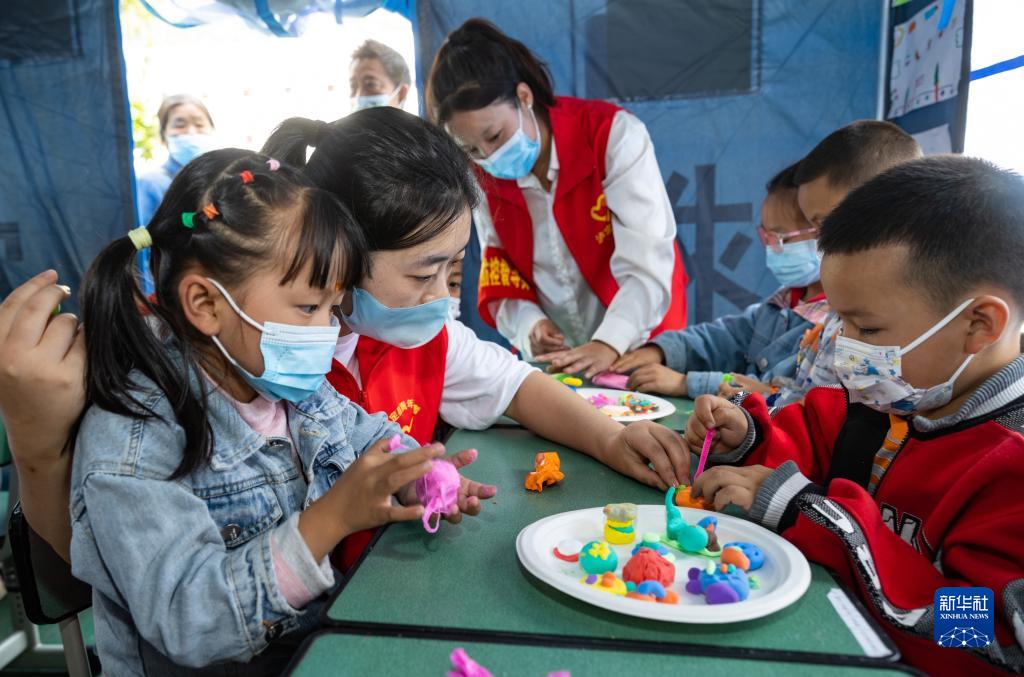 9月10日,在瀘定二中臨時(shí)安置點(diǎn)的“帳篷課堂”里,老師志愿者辜曉鑫(左二)和孫燕(左三)與孩子們一起用橡皮泥制作創(chuàng )意“月餅”。