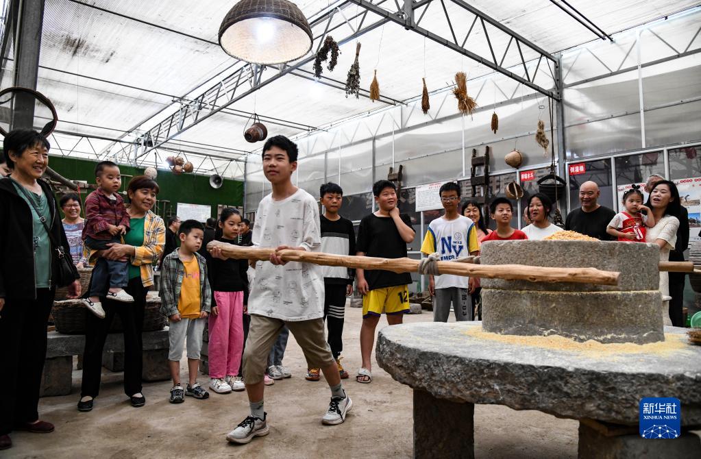9月10日,在河南省濟源市民俗文化展覽館,一名小學(xué)生在體驗推磨。