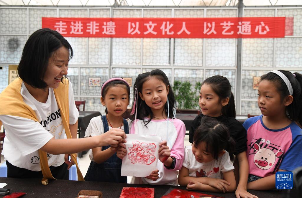 9月10日,在河南省濟源市民俗文化展覽館,一名小學(xué)生展示木版印刷的“?!弊?。