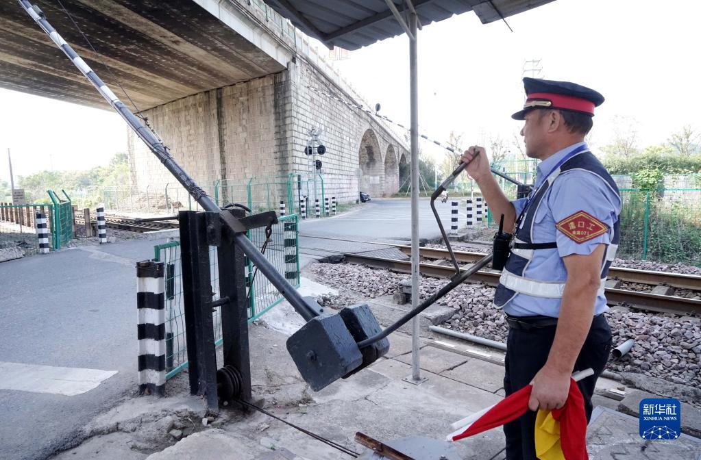 9月10日,浙江省交通集團金溫鐵道公司武義公鐵立交橋道口工朱汝忠接到列車(chē)到來(lái)信號,放下欄桿關(guān)閉道口。