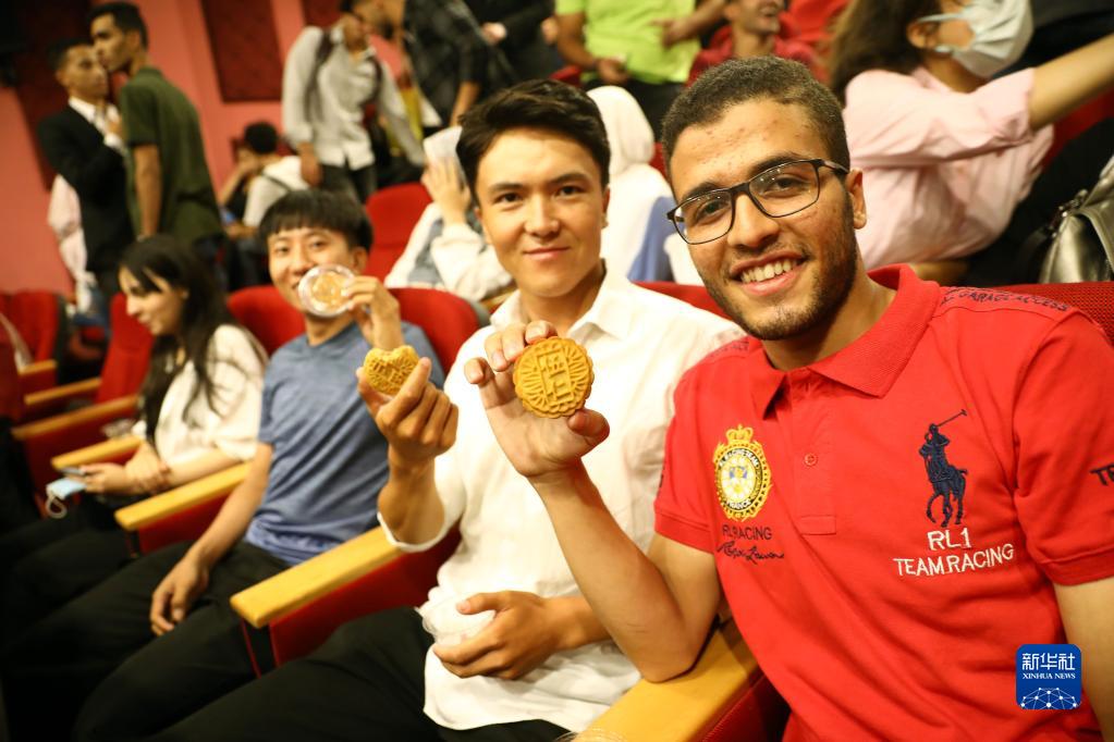 9月8日,在埃及開(kāi)羅,來(lái)自埃及各高校的學(xué)生手拿月餅拍照。