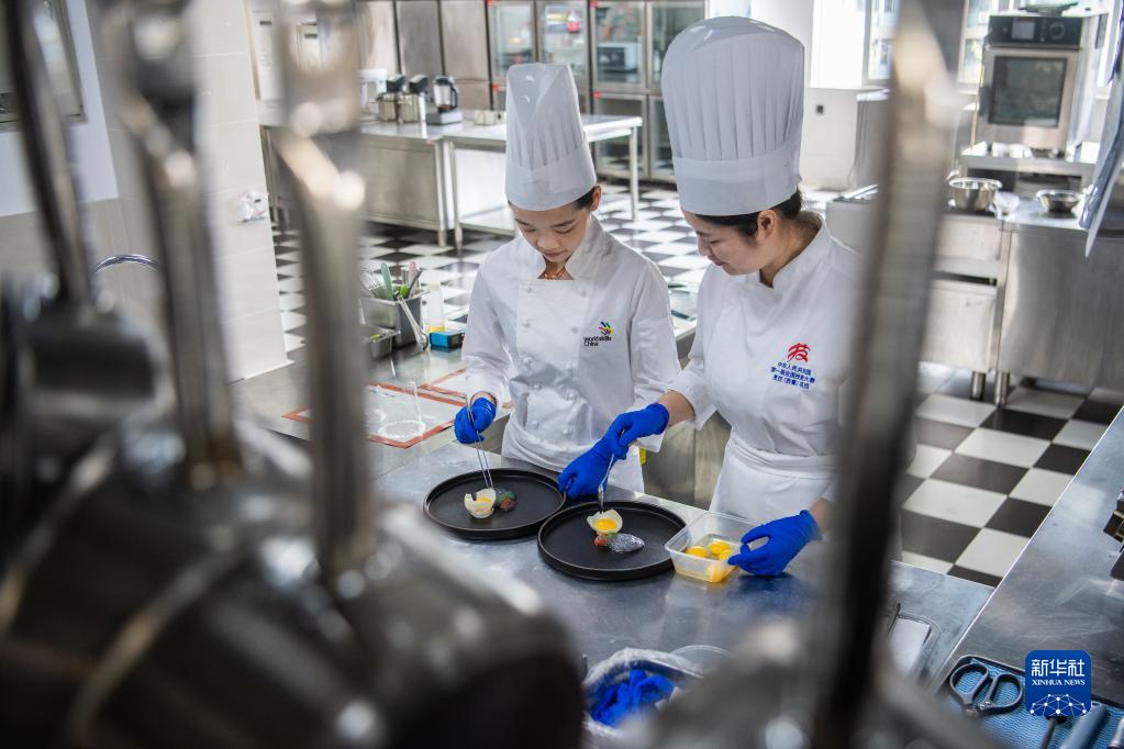 9月9日,湖北楚菜研究院教師沈思靜(左)和李夏薇在研究菜品。