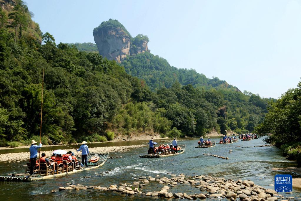 9月11日,在福建武夷山國家公園,游客乘竹筏游覽九曲溪。新華社發(fā)(陳穎 攝)