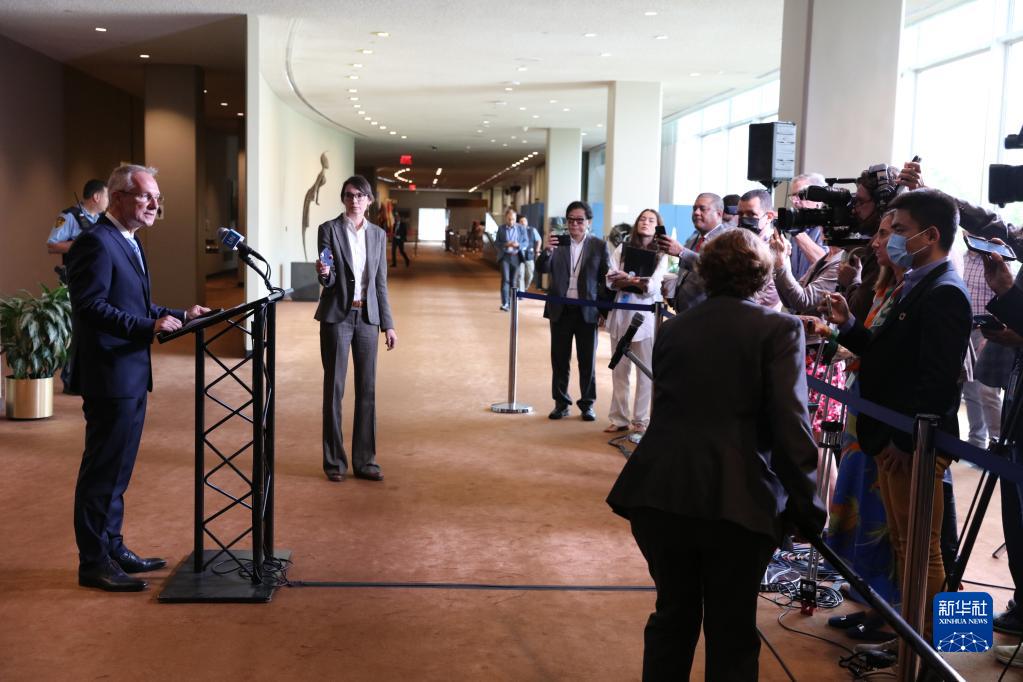 9月12日,在位于紐約的聯(lián)合國總部,匈牙利外交官克勒希(前左)宣誓就任第77屆聯(lián)大主席后出席記者會(huì )。