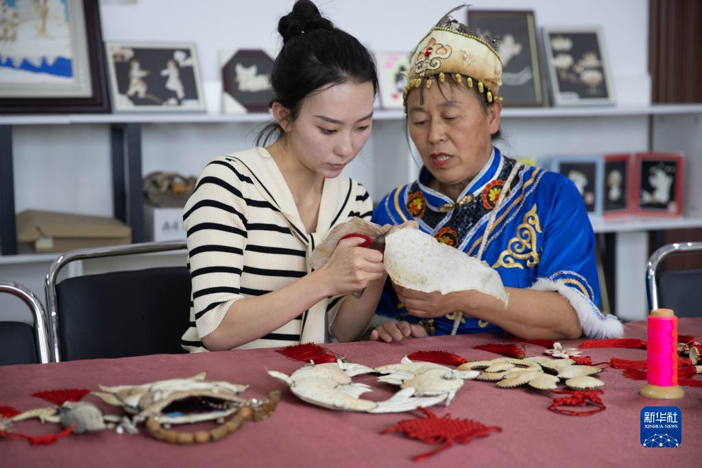 9月7日,在黑龍江撫遠市烏蘇鎮抓吉赫哲族村,尚美含(左)向魚(yú)皮制作技藝傳承人學(xué)習魚(yú)皮藝術(shù)品制作。