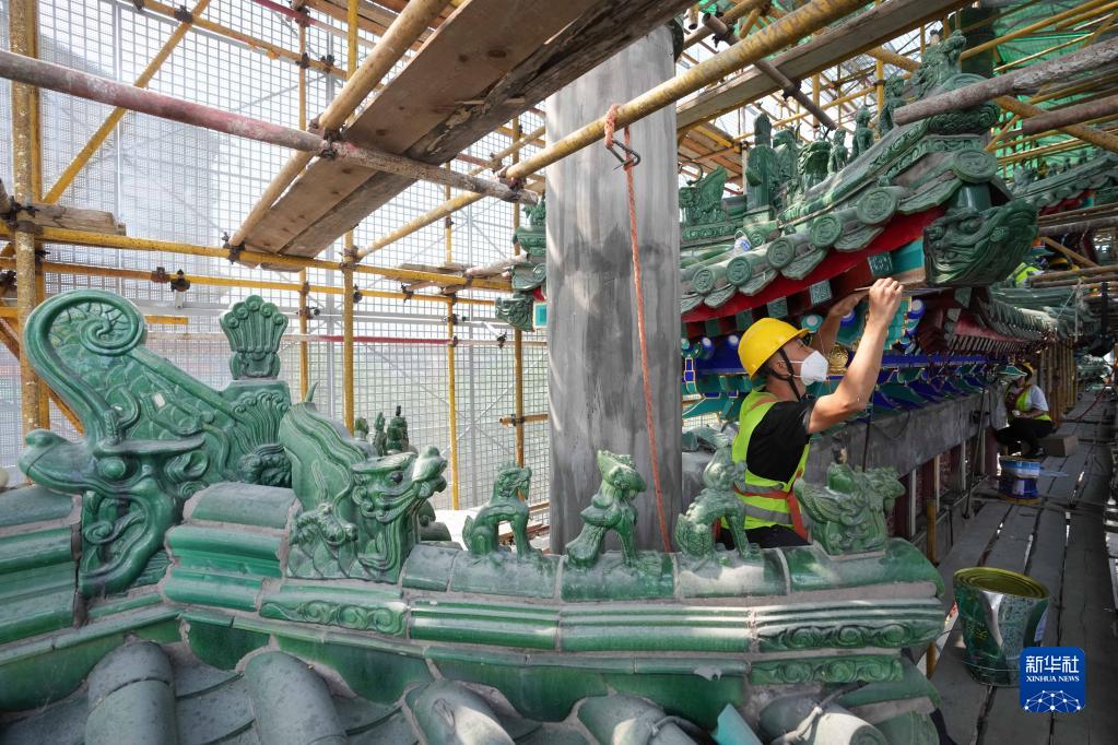 9月15日,施工修繕人員在前門(mén)五牌樓進(jìn)行油飾彩繪翻新。
