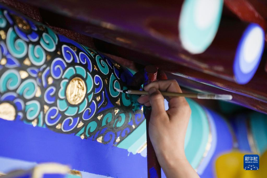 9月15日,施工修繕人員在前門(mén)五牌樓進(jìn)行油飾彩繪翻新。