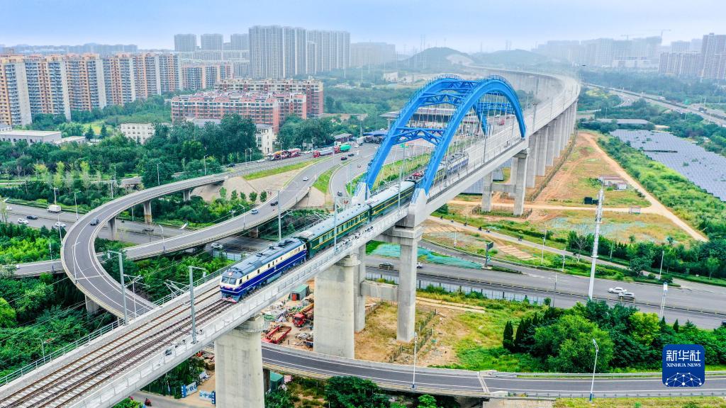 9月15日,檢測列車(chē)駛過(guò)濟萊高鐵歷城站特大橋(無(wú)人機照片)。