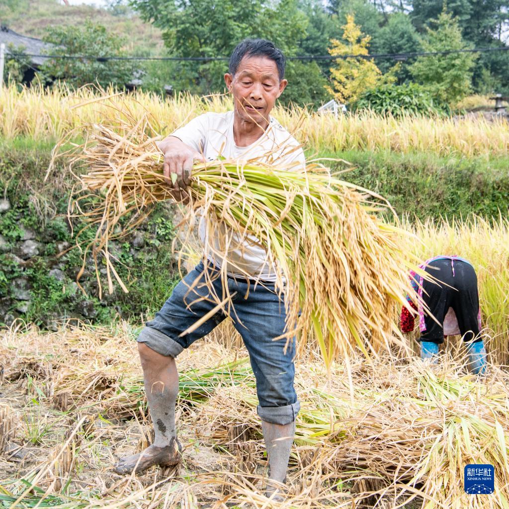 9月14日,在重慶市酉陽(yáng)土家族苗族自治縣花田鄉,稻農在稻田里搶收稻谷。 新華社記者 唐奕 攝