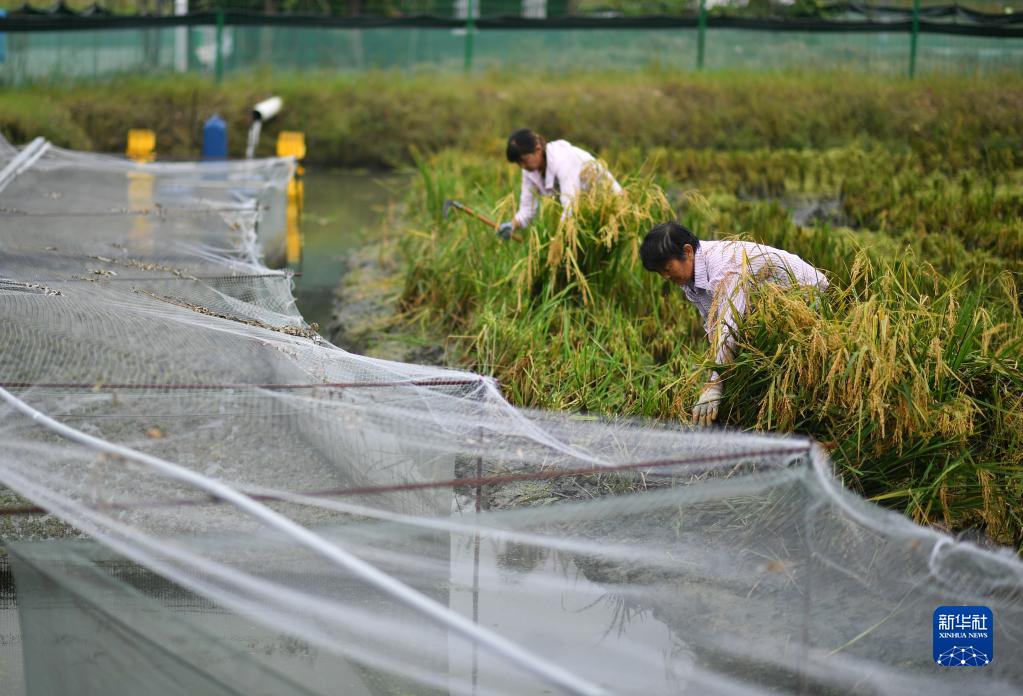 9月15日,農民在漢中市洋縣龍亭鎮一處稻漁綜合種養基地收割水稻,稻田旁是該基地飼養的青蛙。