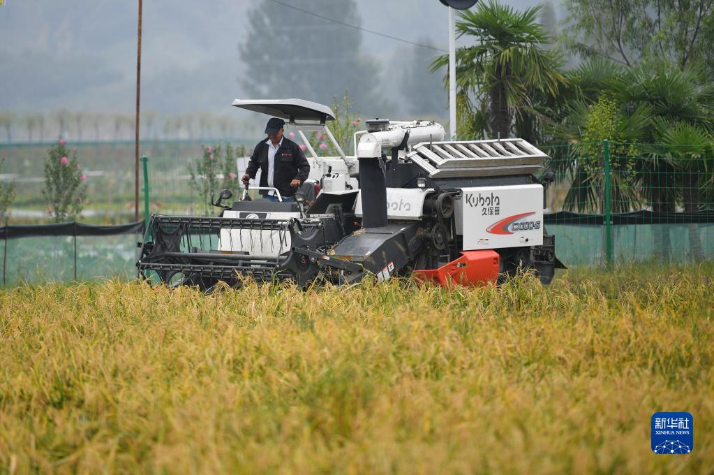 9月15日,農機手駕駛收割機在漢中市洋縣龍亭鎮一處稻漁綜合種養基地收割水稻。