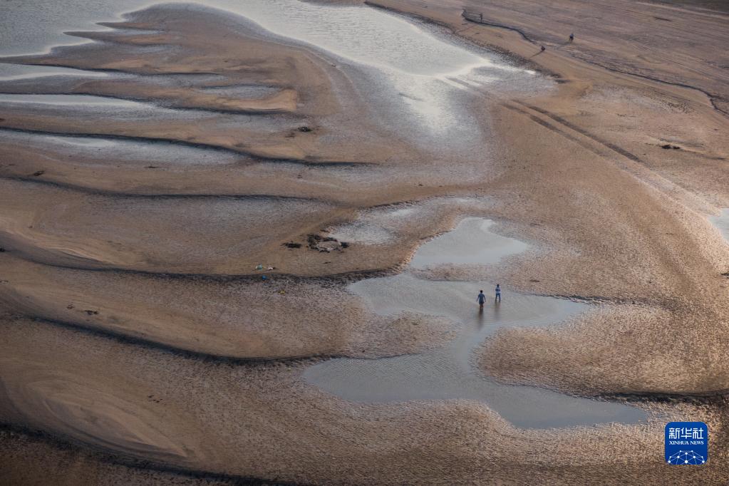 市民在漢口江岸灘涂上游玩(9月13日攝,無(wú)人機照片)。因長(cháng)江武漢段水位持續消退,大片灘涂露出江面,天興洲北岸幾乎與漢口江岸連成一片。
