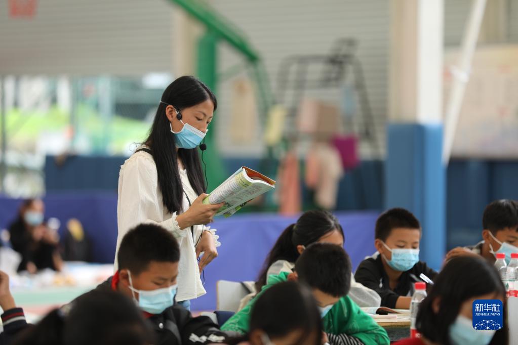 在在四川省雅安市石棉縣王崗坪鄉,老師在國家能源集團大渡河大崗山公司提供的場(chǎng)地為學(xué)生們講課(9月14日攝)。當日,瀘定縣6所小學(xué)、幼兒園恢復線(xiàn)下上課,石棉縣三個(gè)受災鄉鎮學(xué)校也逐步復課。