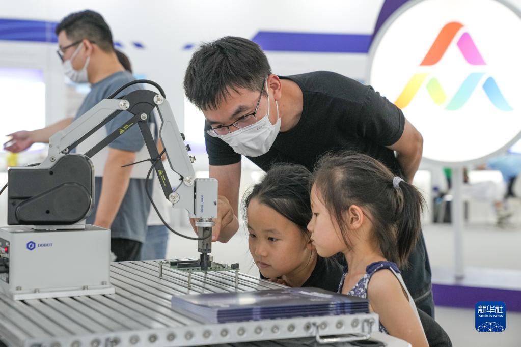 9月17日,在2022年全國大眾創(chuàng )業(yè)萬(wàn)眾創(chuàng )新活動(dòng)周合肥主會(huì )場(chǎng)的主題展區,家長(cháng)帶著(zhù)孩子參觀(guān)智能協(xié)作機械臂。