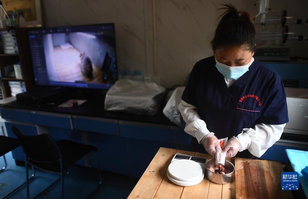 9月18日,青海野生動(dòng)物救護繁育中心工作人員虎文蓉在給荒漠貓準備的晚餐中加入營(yíng)養膏。