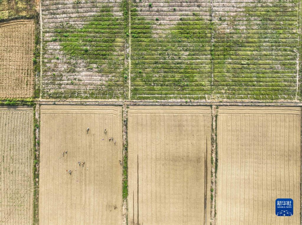 9月18日,農民在湖南省永州市道縣壽雁鎮永豐村蒜苗種植基地趕種蒜苗(無(wú)人機照片)。
