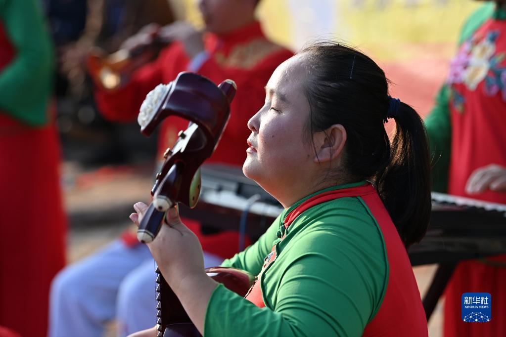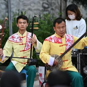陵川縣盲人曲藝宣傳隊隊員在陵川縣楊村鎮泉頭村演出(9月14日攝)。