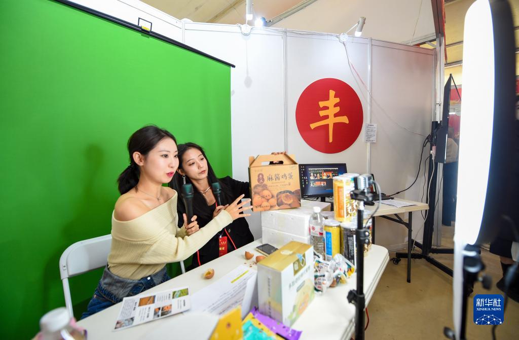 9月19日,主播在2022年內蒙古“中國農民豐收節”主會(huì )場(chǎng)慶?;顒?dòng)上直播帶貨。